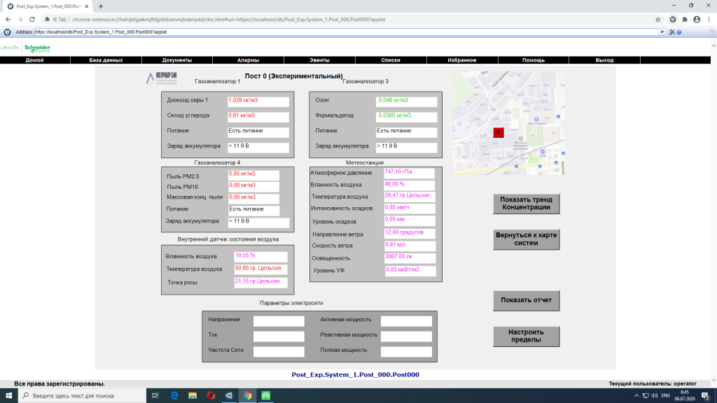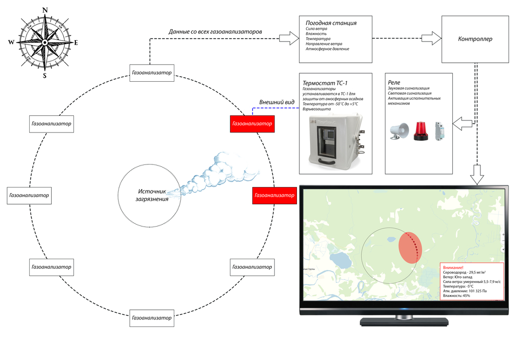 Дополнительные компоненты: сирены, сигнальные лампы, вентиляторы, метеостанции, датчики давления, влажности и температуры, датчики направления и скорости ветра совместимы с нашими компонентами и интегрируются в нашу систему. Программное обеспечение на компьютере оператора агрегирует информацию со всех газоанализаторов и датчиков, с дальнейшей возможностью (при установке доп. оборудования) выполнять обработку полученной информации, в том числе и автоматизированную передачу данных в РГИС, в режиме реального времени. Ниже представлены несколько скриншотов работы в программе.