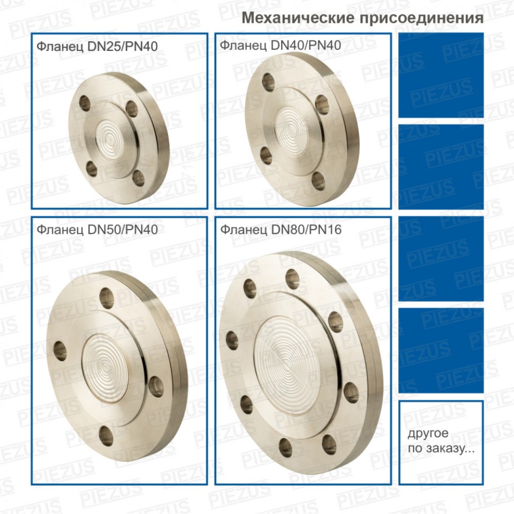 Механическое присоединение: G 1/2ˮ; G 3/4ˮ; G 1ˮ; G 1 1/2ˮ; M20x1,5; Фланцы от DN 25 до DN 80