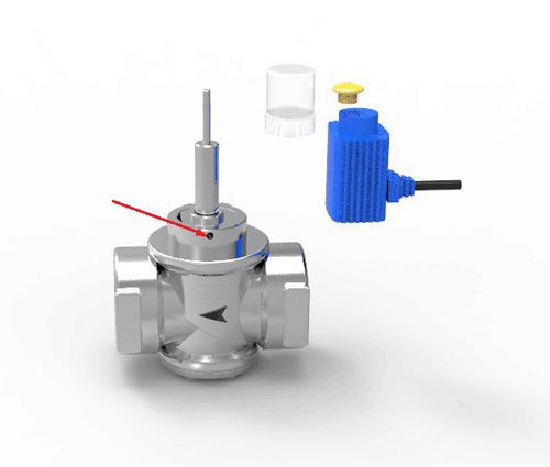 - для того чтобы снять электромагнит, открутите переключатель (головка со штоком), открутите винт с шестигранным шлицем (указан красной стрелкой). Установите клапан на трубу. После этого установите электромагнит, закрепите его винтом, закрутите переключатель. Проверьте правильность сборки открыв и закрыв клапан вручную.