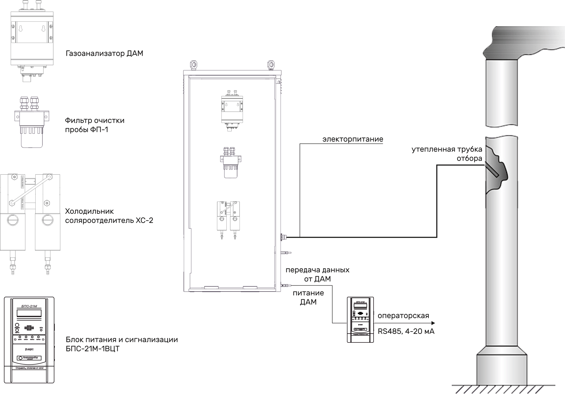 Проба по отборной и утепленной трубе (желательно Ø 12 мм) транспортируется вниз к шкафу газоаналитическому (ШГА), установленному на нулевой отметке. Поступившую пробу охлаждает ХС-2 до температуры внутри ШГА производит сбор и слив конденсата. ФП-1 производит очистку пробы уровня 5 мкм, далее проба через вентиль трехходовой ВТ (работа/коррекция) поступает на входной штуцер датчика-газоанализатора ДАМ.