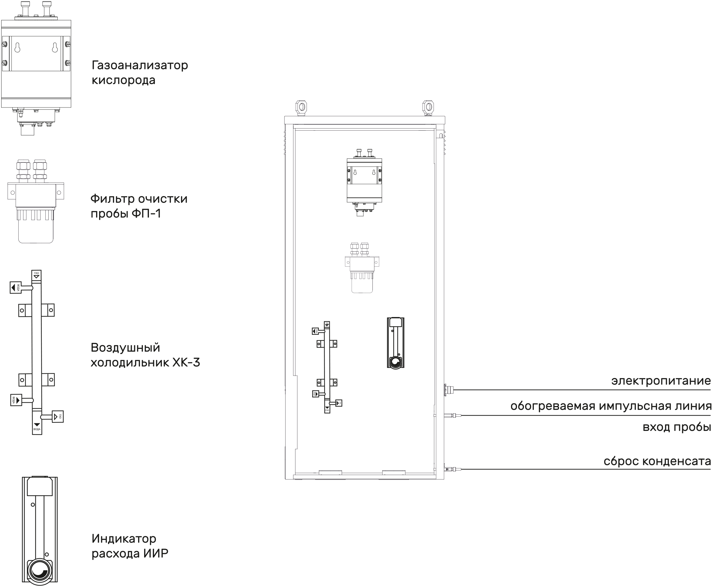 - доставка, очистка, охлаждение анализируемой газовой смеси (пробы) к анализатору кислорода и сброса пробы и конденсата;