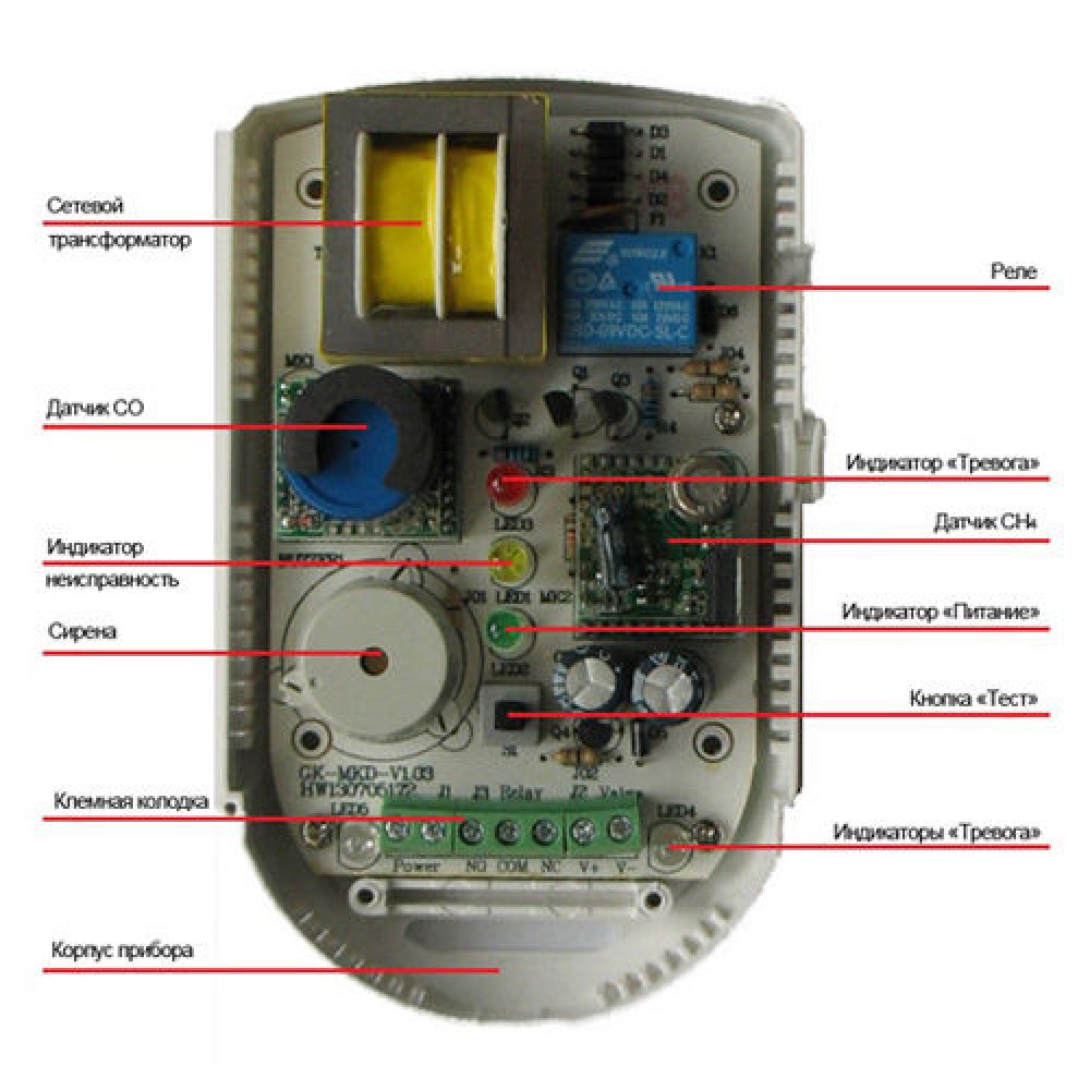В каждом приборе установлено электромагнитное реле. Контакты подключены к клеммам, как показано на схеме. При превышении порогового уровня концентрации контролируемого газа (сигнале Тревога) происходит переключение контактов. Данное реле можно использовать для подключения дополнительного извещателя, вытяжного устройства, электромагнитного клапана (нормально закрытого или нормально открытого). Допустимое напряжение на контактах реле 220В, ток 6А.