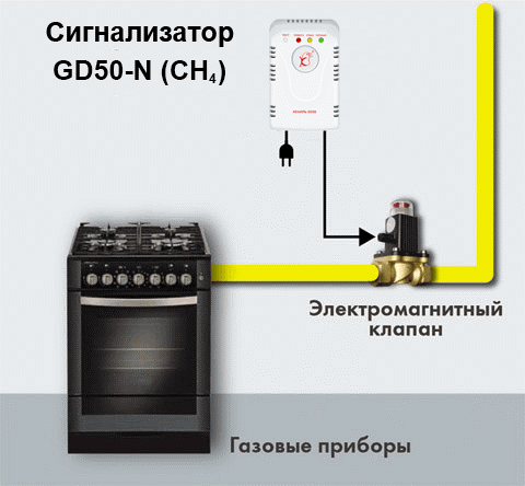 состоит из сигнализатора загазованности Кенарь GD50-N и клапана