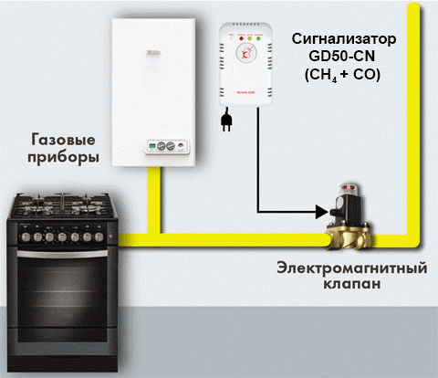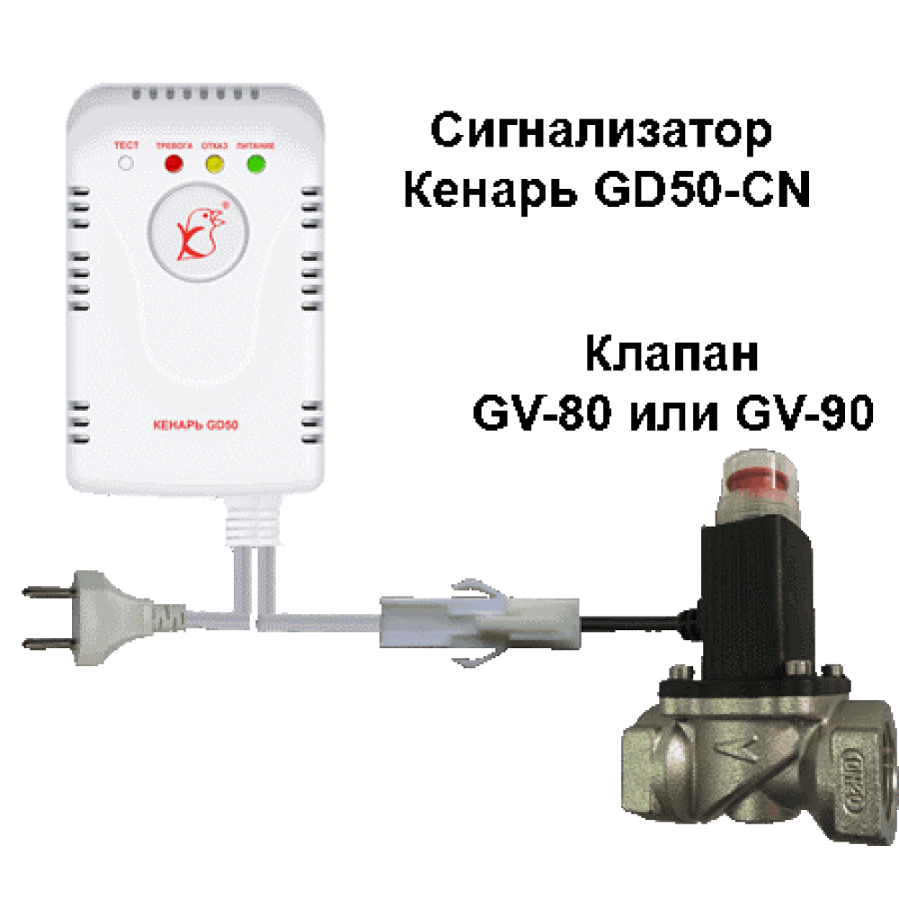 состоит из сигнализатора загазованности Кенарь GD50-CN и клапана