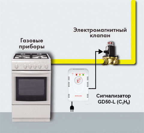 состоит из сигнализатора загазованности Кенарь GD50-L и клапана