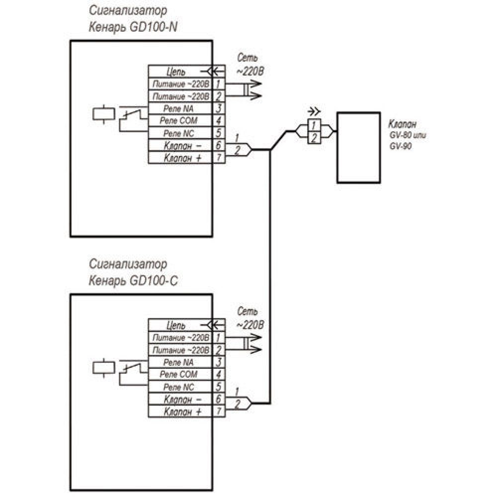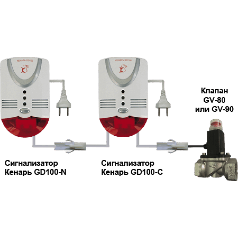 Cостоит из отдельных сигнализаторов загазованности Кенарь GD100-N, GD100-C и клапана